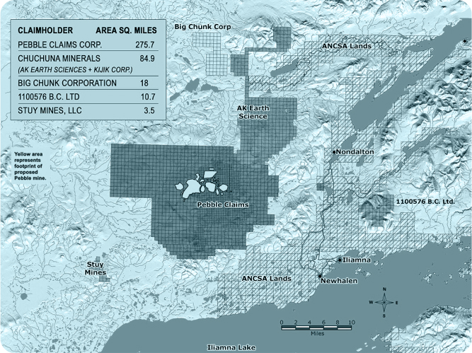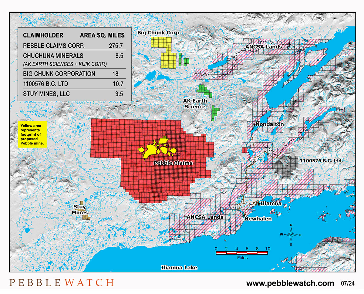 Multiple entities own claims in the Pebble deposit area, with most held by Pebble Claims Corp.