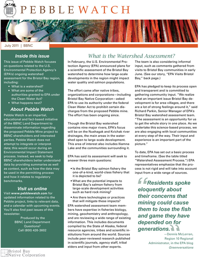The U.S. Environmental Protection Agency (EPA) has updated its web site with several documents related to its ongoing watershed assessment of Bristol Bay. These include a draft watershed assessment outline, presentations and diagrams from the Intergovernmental Team Meetings it held last week. The meetings were held in order to talk with scientists and technical staff … Continued