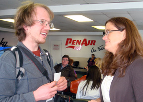 Pebble Limited Partnership staff and contracted scientists waiting at the Dillingham airport after the WASIC conference. Front, l. to r.: Jane Whitsett (PLP), Laura Tesch (PLP), Dr. Jaime Cathcart (Knight Piesold). Back, l. to r.: Dr. MaryLou Keefe (R2 Resources), Dr. Dudley Reiser (R2 Resources), Dr. Stephen Day (SRK Consulting)
