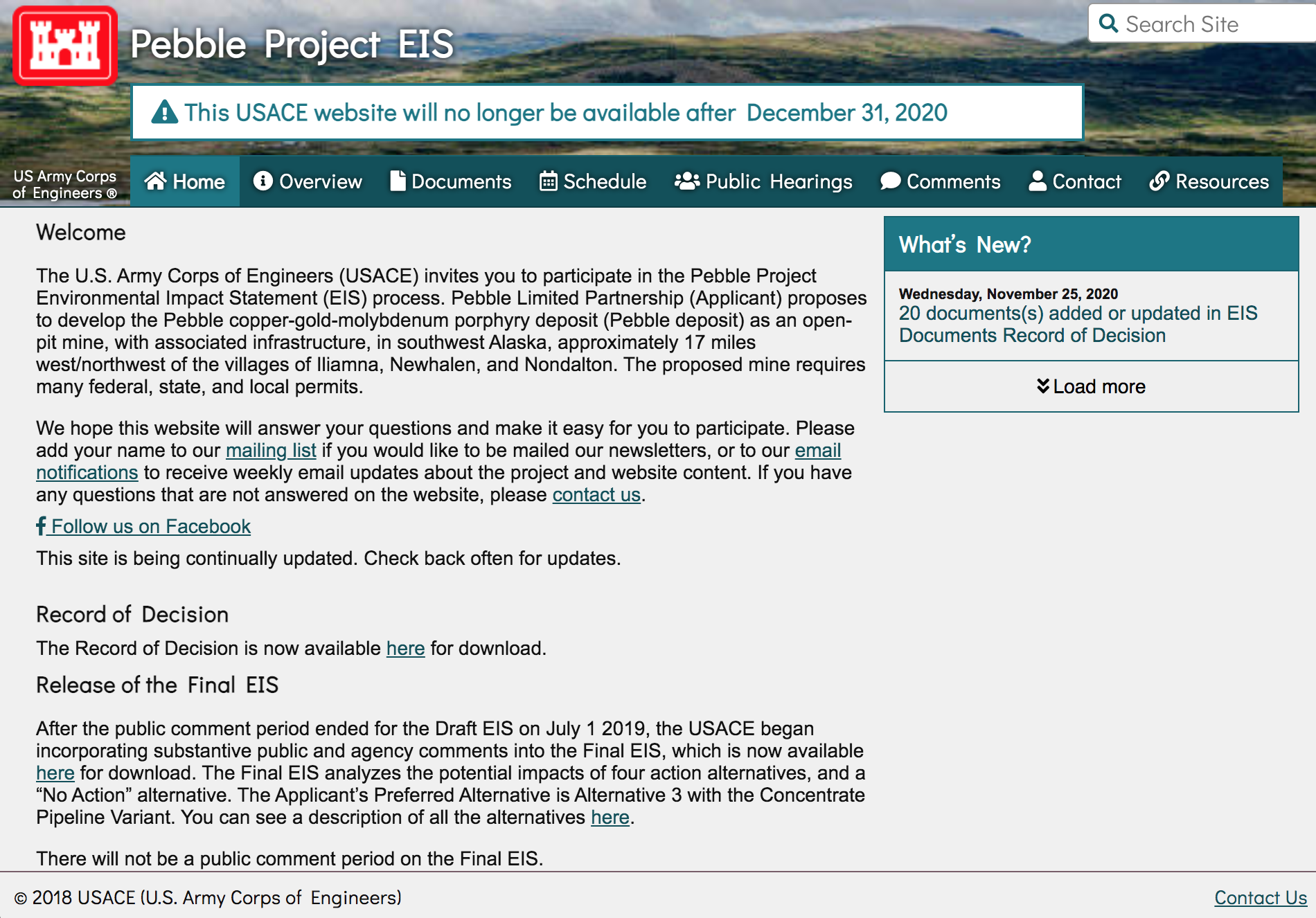 On November 24, 2020, the U.S. Army Corps of Engineers released a Record of Decision on the Pebble project. Subsequently, the agency retired the website associated with the permitting process for the Pebble project. PebbleWatch had linked extensively to this site as a primary source for documentation on the project and permitting process. On this page, we provide access to relevant documents that were housed at the Corps’ previous site.