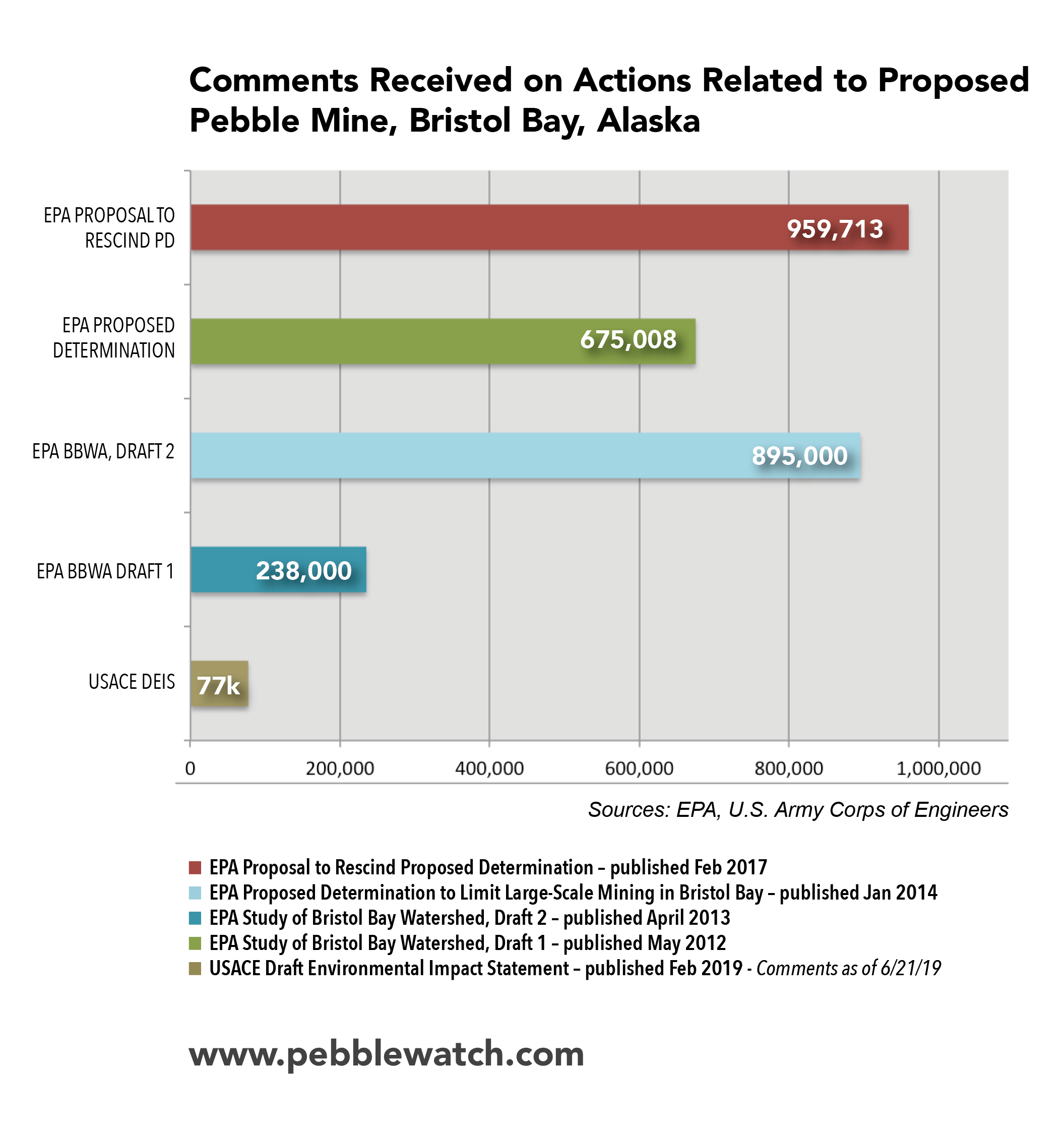 Wondering how the number of comments for the Draft EIS compares with other Pebble mine relevant documents that had public comment periods?  We compared the number of comments received as of June 21 with those received for the EPA’s Bristol Bay Watershed Assessment (both drafts), its Proposed Determination and Proposal to Rescind the Proposed Determination. … Continued